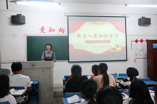 5名17级学生党员进入新生班级,以“不忘初心,牢记使命”为主题,对“什么是中国共产党”、“为什么加入中国共产党”、“加入中国共产党的流程”、“新生入党条件”、“入党申请书及个人自传的书写”等几个方面进行了详细的介绍,并引导同学们要端正入党动机,努力学习,提升自己,报效祖国。宣传过程中,宣讲人与同学们互动频繁,对于宣讲人的发问,同学也踊跃回答,展示了同学们对党的热爱和敬重。学生党员结合自身的情况尤其督促新生做人做事务必踏实诚恳,切莫浮躁,理智规划时间,高效率学习,积极主动完成任务。并对新生提到的一系列问题做了详细的解答,鼓励新生积极参加政治学习。