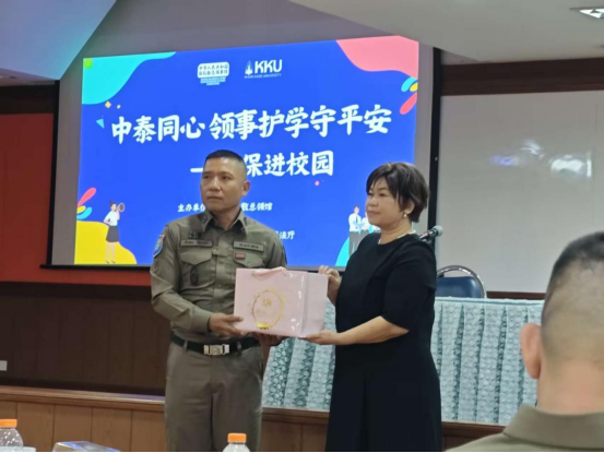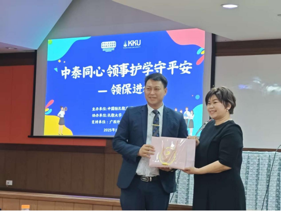 讲座伊始,中国驻孔敬总领馆代表周广旭先生向在场中国学子致以诚挚问候。他着重强调,安全是海外求学的首要前提,同学们需严格遵守泰国当地法律法规,若遇困难可第一时间联系总领馆,总领馆将始终为大家提供支持。随后,孔敬大学人文学院助理教授Dararat Kamphusan对总领馆、泰国移民局、旅游警察等部门代表的到来表示热烈欢迎,并向在场代表赠送纪念品。