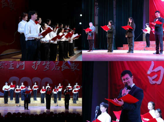 整场晚会节目形式多元、精彩纷呈,朗诵、歌舞、光影剧、情景剧等十余档节目轮番登场,既展现了学子们的多才多艺,更将护理职业精神融入艺术表达。其中,由王中立、倪竞、李妍、叶碧云四位教师代表与学生联袂演绎的朗诵《传承》,以铿锵有力的语调回溯护理事业的百年荣光,用真挚饱满的情感诠释“生命守护者”的责任担当,传递出护理精神薪火相传的动人力量,引发全场强烈共鸣。