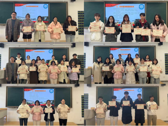 与会老师与主席团成员分别为思政教育类、创新创业类、文学知识类、美育素养类、媒体宣传类、文体活动类的获奖者颁发荣誉证书。