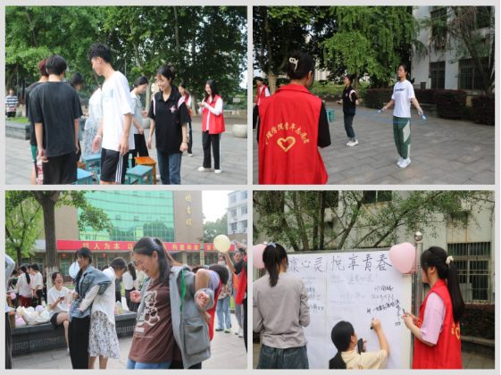 心理健康在于倾诉,身体健康在于运动。倾述情绪过后,在青年志愿者的组织下,同学们进行了多项趣味活动。紧张刺激的抢凳子、趣味跳绳、挤气球、和心灵留言板···同学们朝气蓬勃,掌声、呼声、助威声不断在广场上回荡,在游戏中体会团结互助 ,释放生命“多巴胺”,演绎精彩青春。