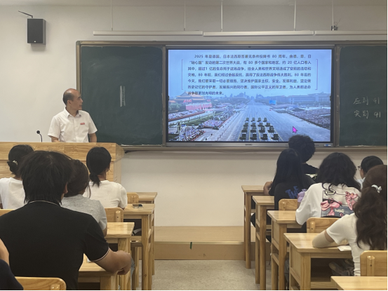 在研究生楼131教室,张友木以“弘扬伟大抗战精神,书写无愧于时代的青春篇章”为主题,为护理A2515班同学上了一堂精彩生动的开学第一课。他从中国人民抗日战争的历史进程、中国共产党在抗日战争中发挥了中流砥柱作用、中国人民抗日战争的历史意义以及抗战精神的历史启示和时代价值四个方面展开讲授,重点围绕抗战精神的历史启示和时代价值,和同学们进行深入交流。